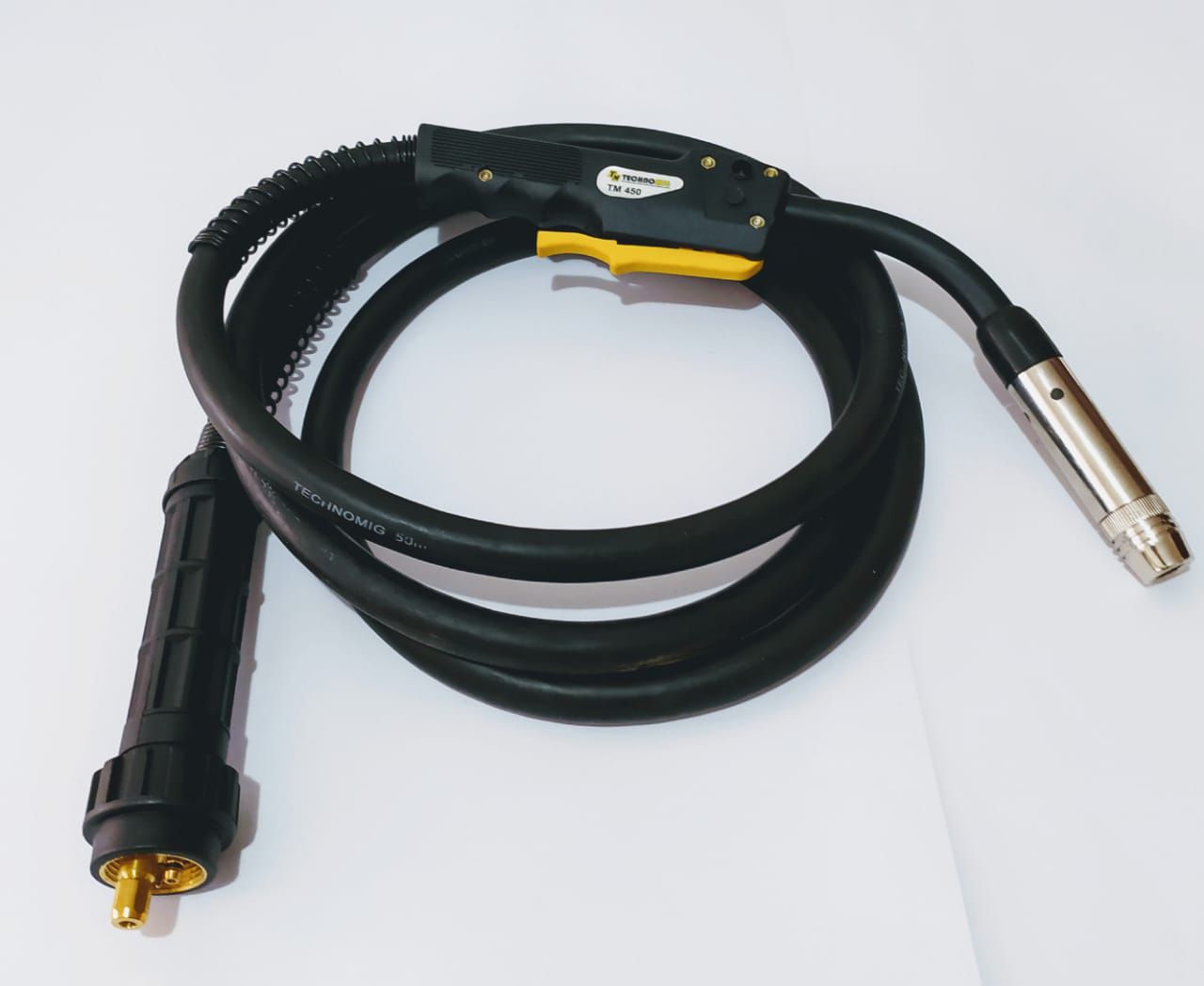 Tocha Mig 450 Marca Technomig. De 3 e 5 metros de comprimentos. Sendo versátil e compacta, resistente a impactos, com isolamento térmico e elétrico. Ideal para serralherias, oficinas e indústrias metalúrgicas. Utilizada para soldas pesadas, em geral. É usada com arame de 0,8 mm a 1,6 mm de espessura.