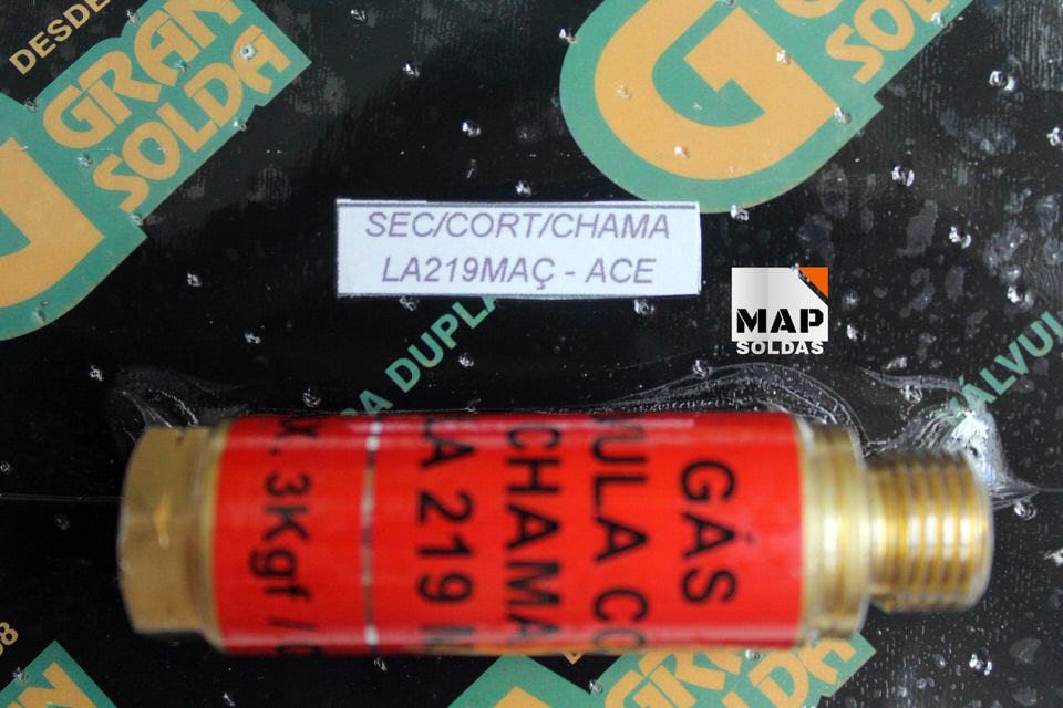 Válvula Corta Chama Maçarico Acetileno da Marca Ecosolda. Tendo um sistema de segurança construído conforme norma (ISO) 5175 classe 1. É usada nos Maçaricos de Corte e Maçarico de Solda. Tendo a função de extinguir o retrocesso da chama através do filtro de aço inox. Sempre que isto ocorrer e impedindo o retrocesso dos gases, servindo em todos os maçaricos do mercado. Tendo uma pressão máxima de trabalho: 1,5 bar / 21 psi. Conexão com rosca esquerda 9/16, gerando maior segurança.